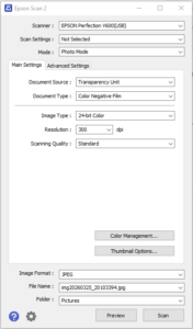 - Make sure the program is in “Photo Mode”, with document source “Transparency Unit” (film)